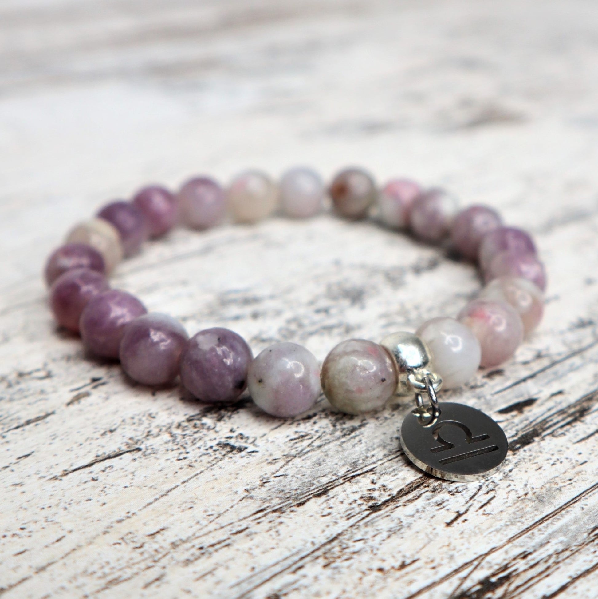 Our beautiful Libra Bracelet is lovingly made with 8mm Pink Tourmaline Beads on strong elastic cord and finished with a 12mm Stainless Steel Zodiac Charm.